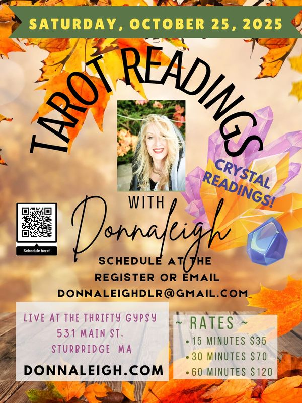 On Saturday, October 25, 2025, I will be returning to The Thrifty Gypsy, located at 531 Main St, Sturbridge, Massachusetts, for live in-person readings. I'll be bringing along my beautiful Crystals to read, Tarot, and Lenormand cards (a vintage card system from the late 1800s known for its precision and accuracy).